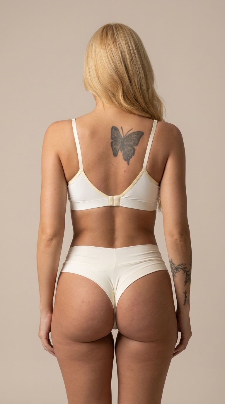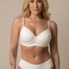 O sutiã é sem bojo, com aro e elástico embutido — estrutura leve, sem volume extra, para quem prefere um visual natural.